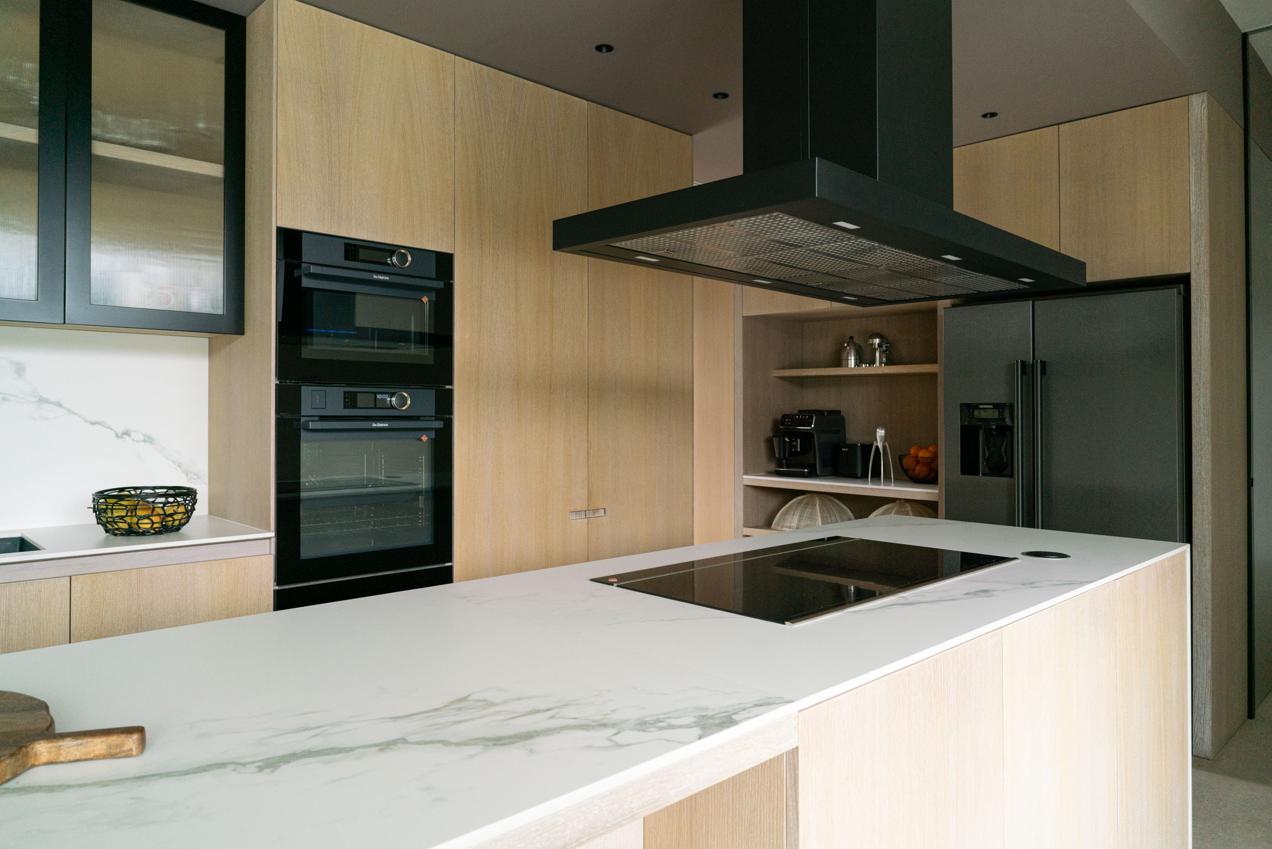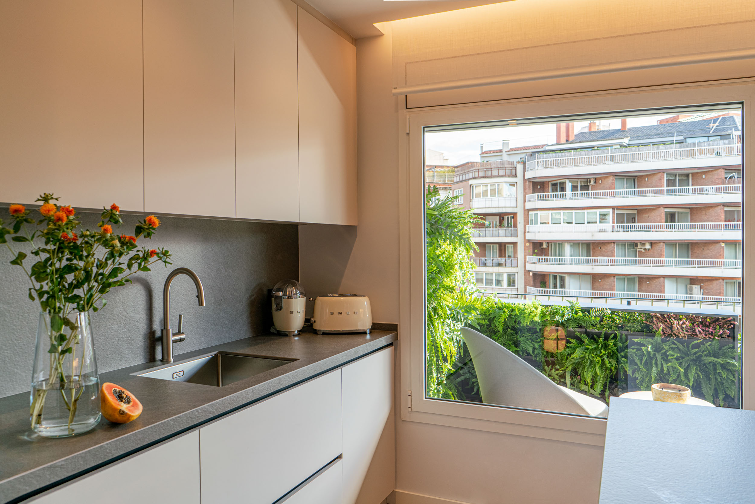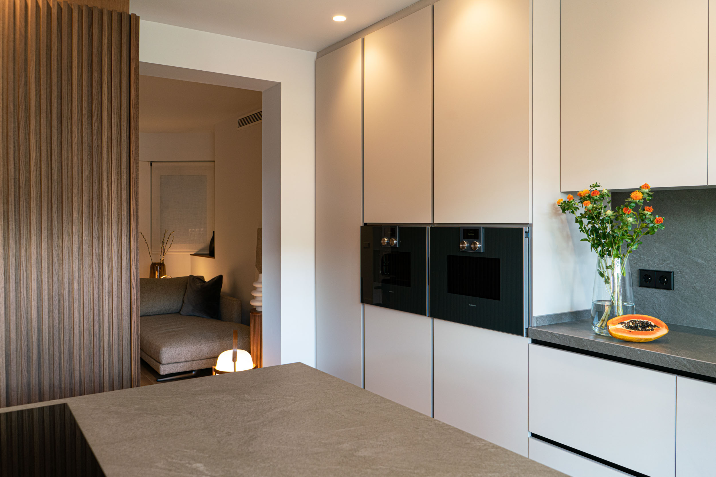 En estos proyectos nos referimos a la integración total con el salón: el mobiliario de cocina se trata como si fueran muebles de salón, utilizando panelados de madera que ocultan la zona de aguas o la columna de hornos para lograr una estética fluida y coherente.